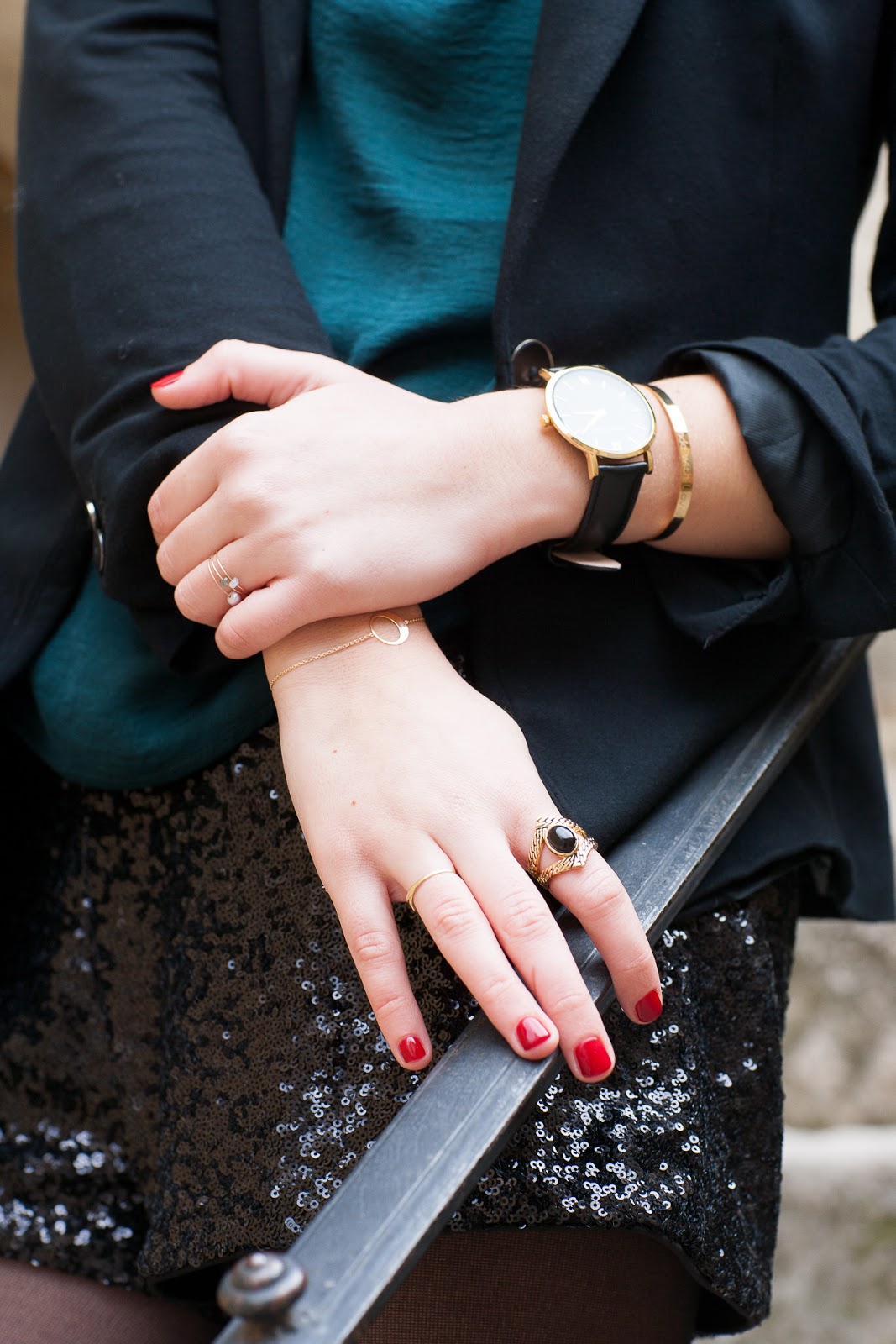 D’ailleurs! Parlons maintenant plus en détails de cette première tenue! J’ai opté pour un short à sequins (que je vous avez d’ailleurs montré sur Snap) et un haut vert “sapin” (une couleur que j’adooooore) qui selon moi sont parfaits pour une tenue de fête! Quant aux accessoires, je porte des bottines noires, un sac inspiration Chloé de chez Feeling on (à retrouver ici) et des bijoux dorés. Gros coup de cœur pour mon nouveau bracelet en or de chez By Natalia qui a une histoire juste trop jolie :