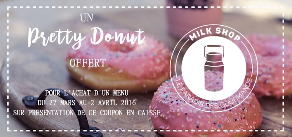 Mais la méga bonne nouvelle c’est que celui-ci sera vendu cette semaine en édition limitée, soit du 27 mars au 2 avril. Mais ce n’est pas tout ! On a voulu encore plus vous gâter avec une autre très bonne surprise ! Vous trouverez à la fin de cet article un bon avec lequel vous pourrez avoir un Pretty Donut gratuit pour tout achat d’un menu ! En effet il vous suffira de vous rendre au Milk shop avec une capture d’écran de ce bon et un donut tout rose vous sera donc offert pour tout menu acheté. De quoi finir le repas en douceur !