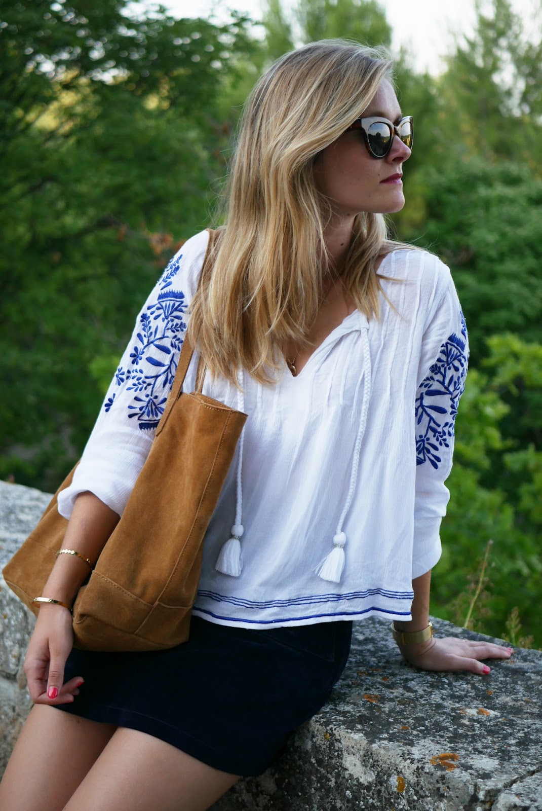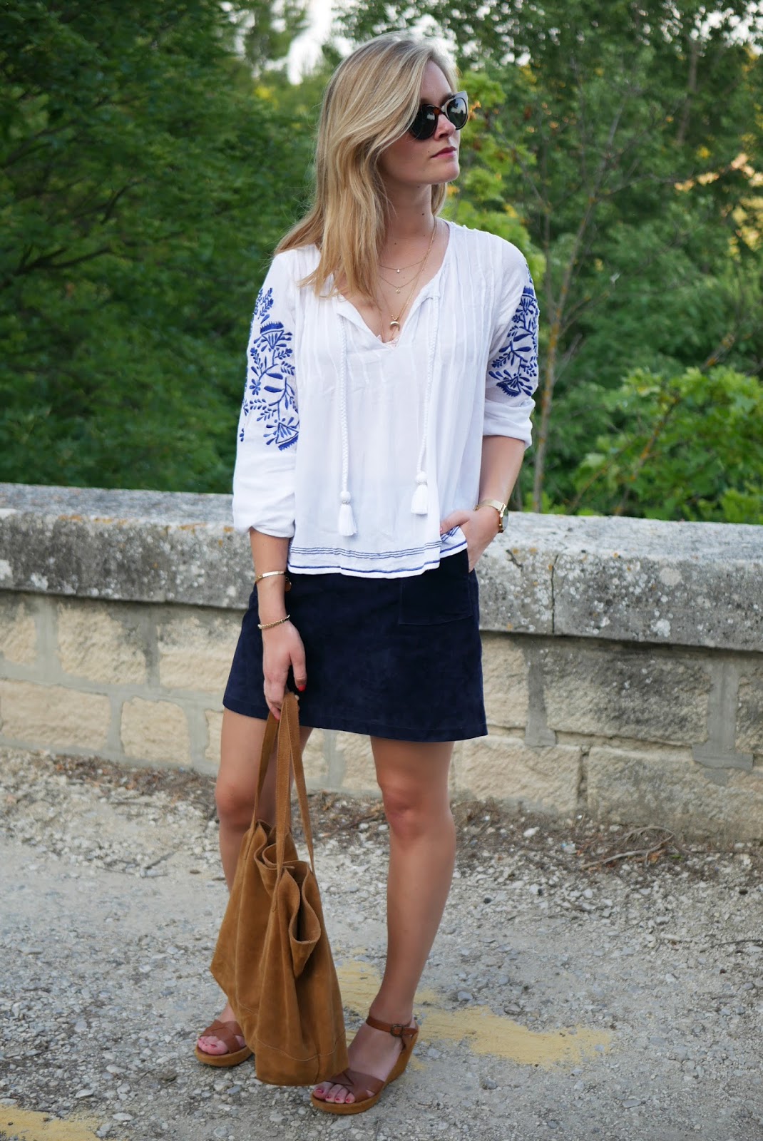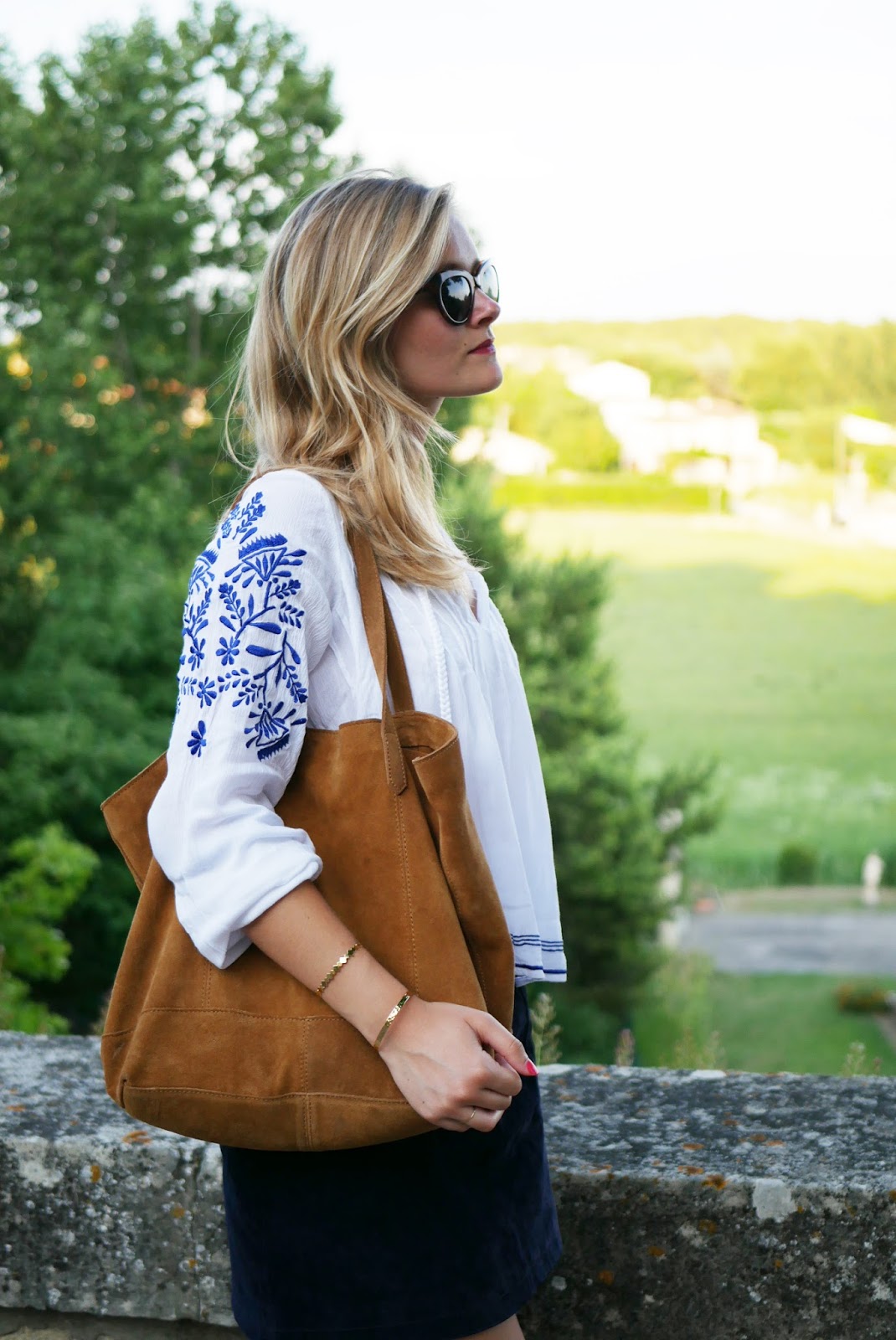 Pour le haut j’ai opté pour une blouse blanche avec des broderies bleues de chez Revolveclothing (vous pouvez la trouver ici ) que je trouve juste trop mignonne ! Elle est cependant assez courte donc si vous aimez porter que des hauts assez longs ça ne sera pas pour vous 🙂 J’ai moi même pas du tout l’habitude de porter des hauts courts comme celui-ci mais sur une jupe ça ne me gêne pas.