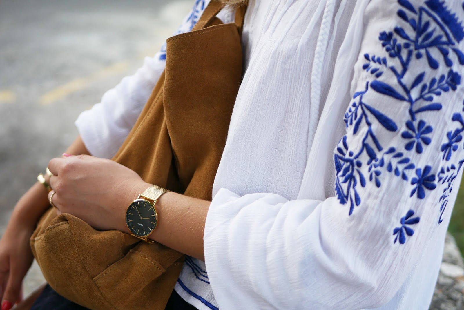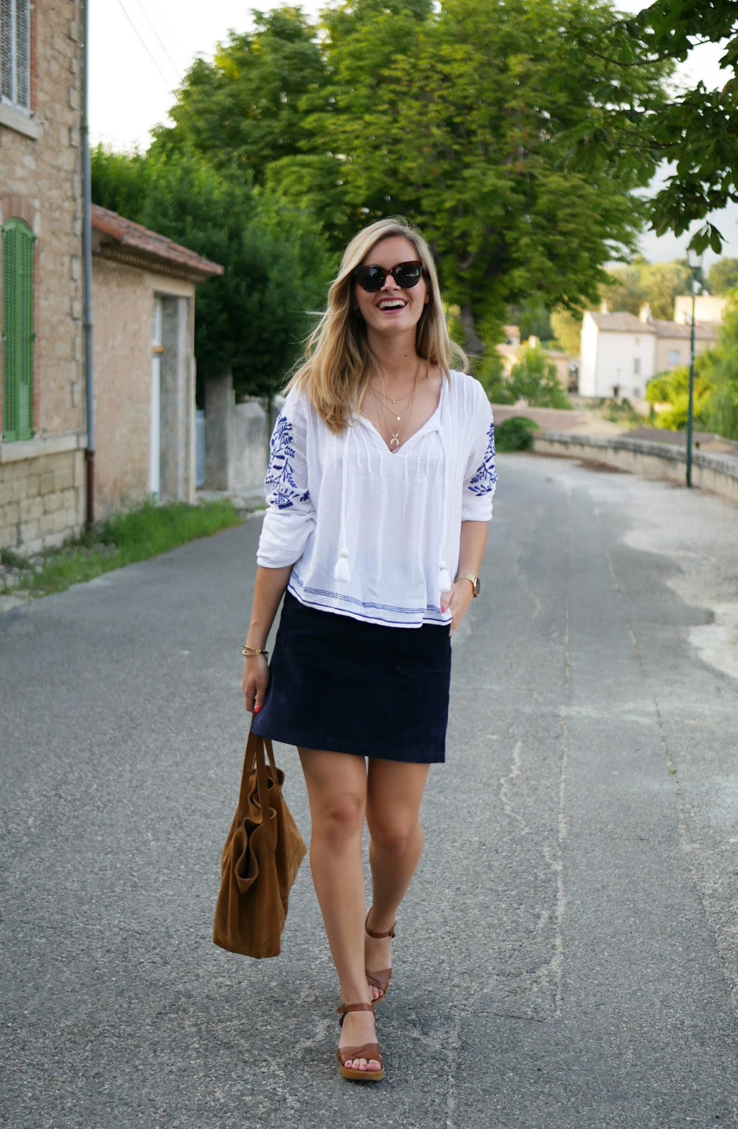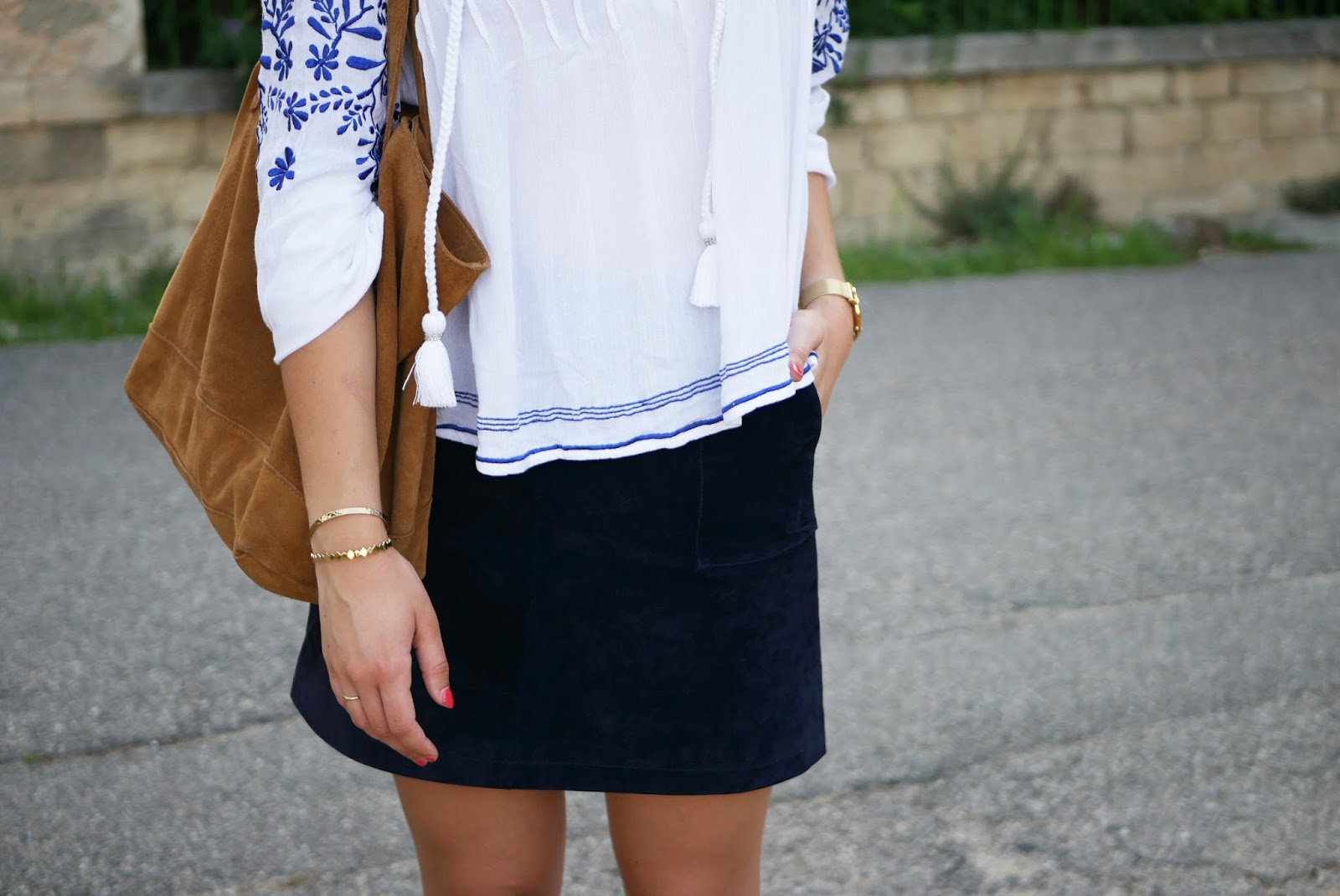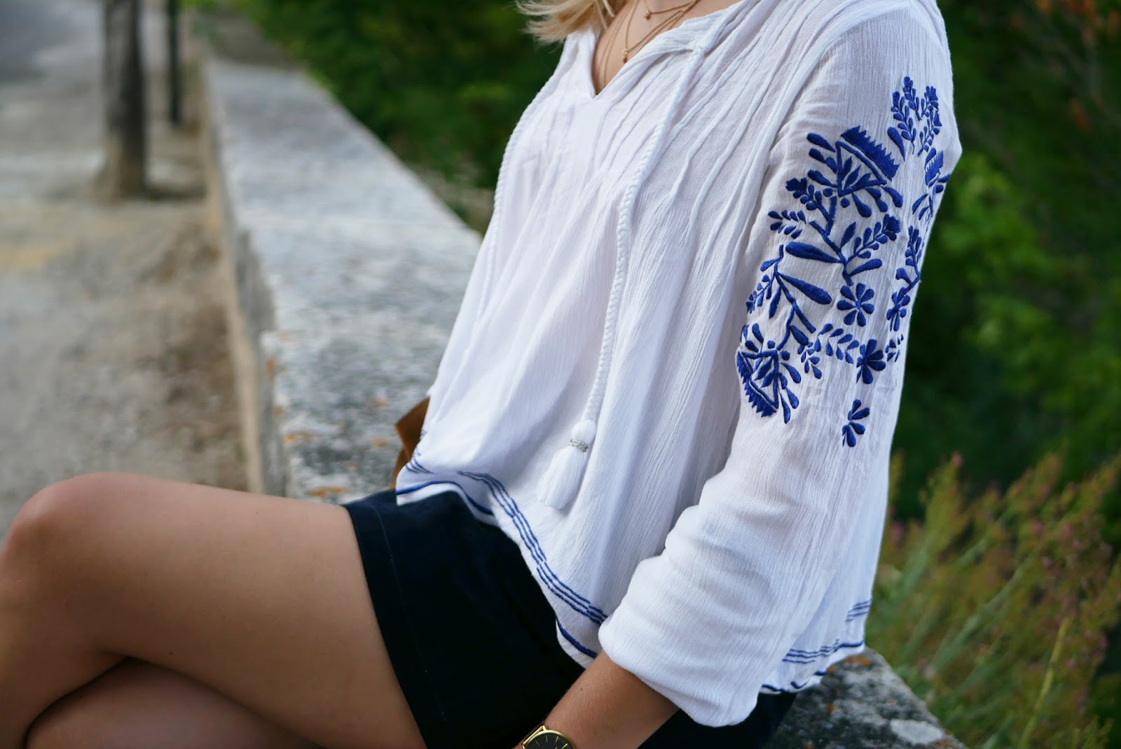 Pour le haut j’ai opté pour une blouse blanche avec des broderies bleues de chez Revolveclothing (vous pouvez la trouver ici ) que je trouve juste trop mignonne ! Elle est cependant assez courte donc si vous aimez porter que des hauts assez longs ça ne sera pas pour vous 🙂 J’ai moi même pas du tout l’habitude de porter des hauts courts comme celui-ci mais sur une jupe ça ne me gêne pas.