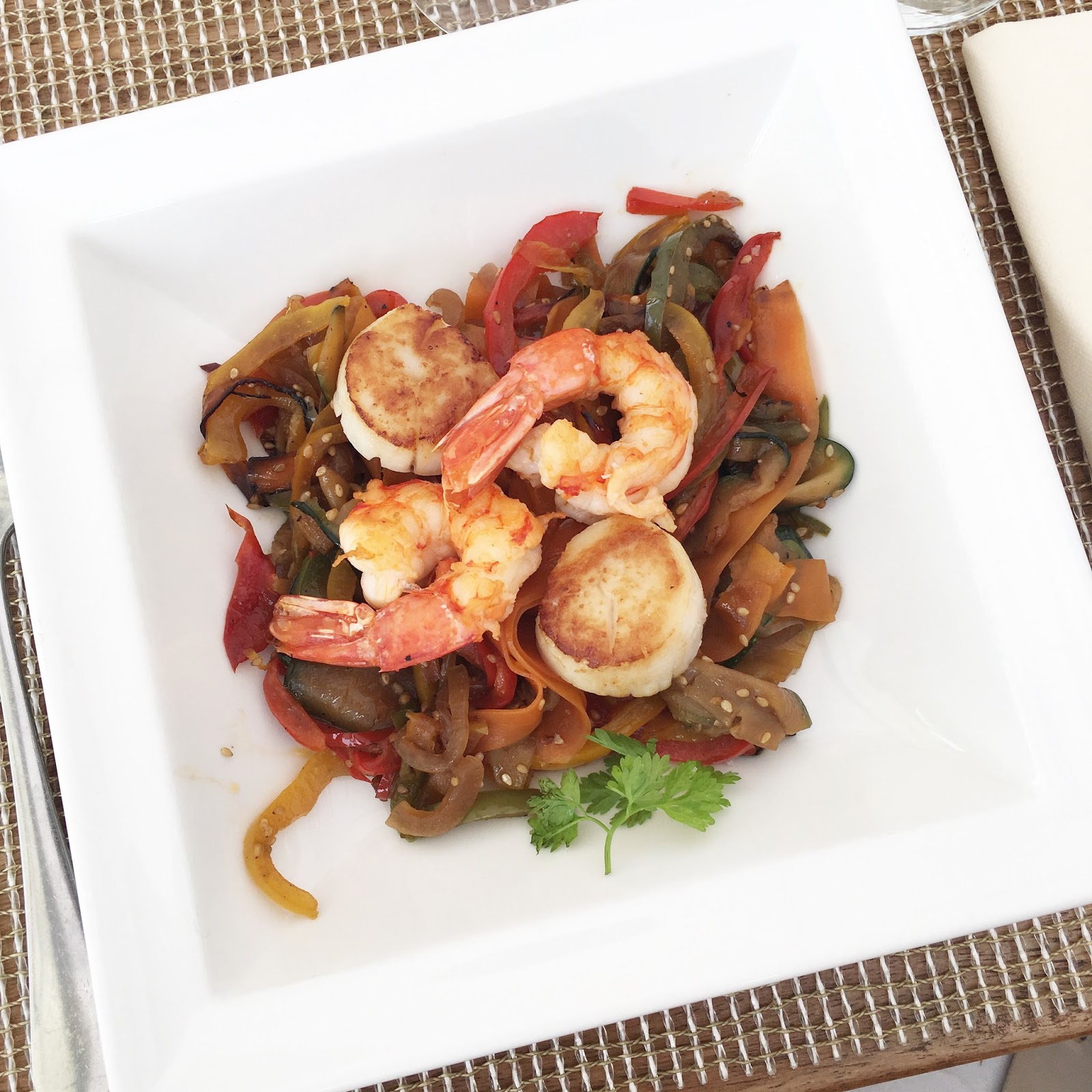 Au programme du déjeuner en bord de mer : jambon et fromage du pays pour l’entrée, poêlée de légumes, crevettes et noix de St Jacques pour le plat et tarte au citron meringuée en dessert.