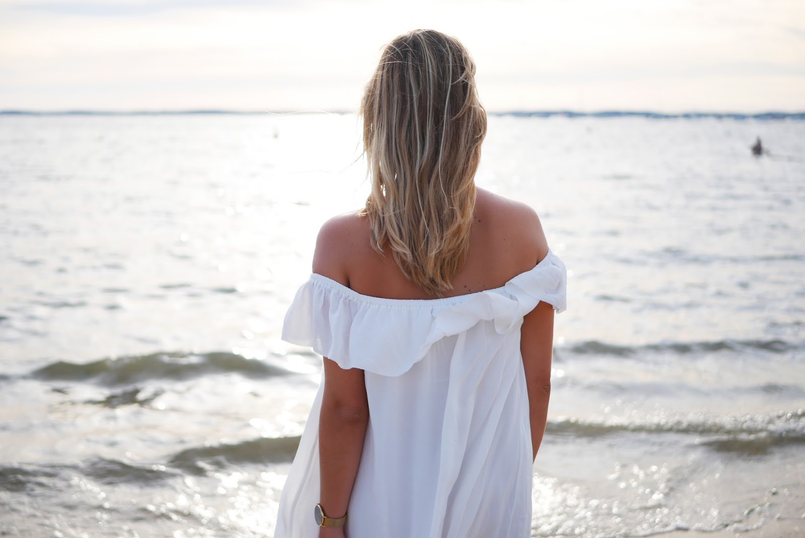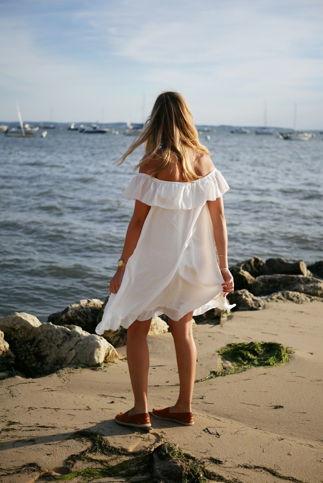 Je trouve que cette tenue est vraiment très simple mais parfaite pour une balade sur la plage le soir. Je trouve que cette robe de part son col bardot et son petit volant en bas se suffit à elle même. C’est, je pense, MA robe préférée de l’été.