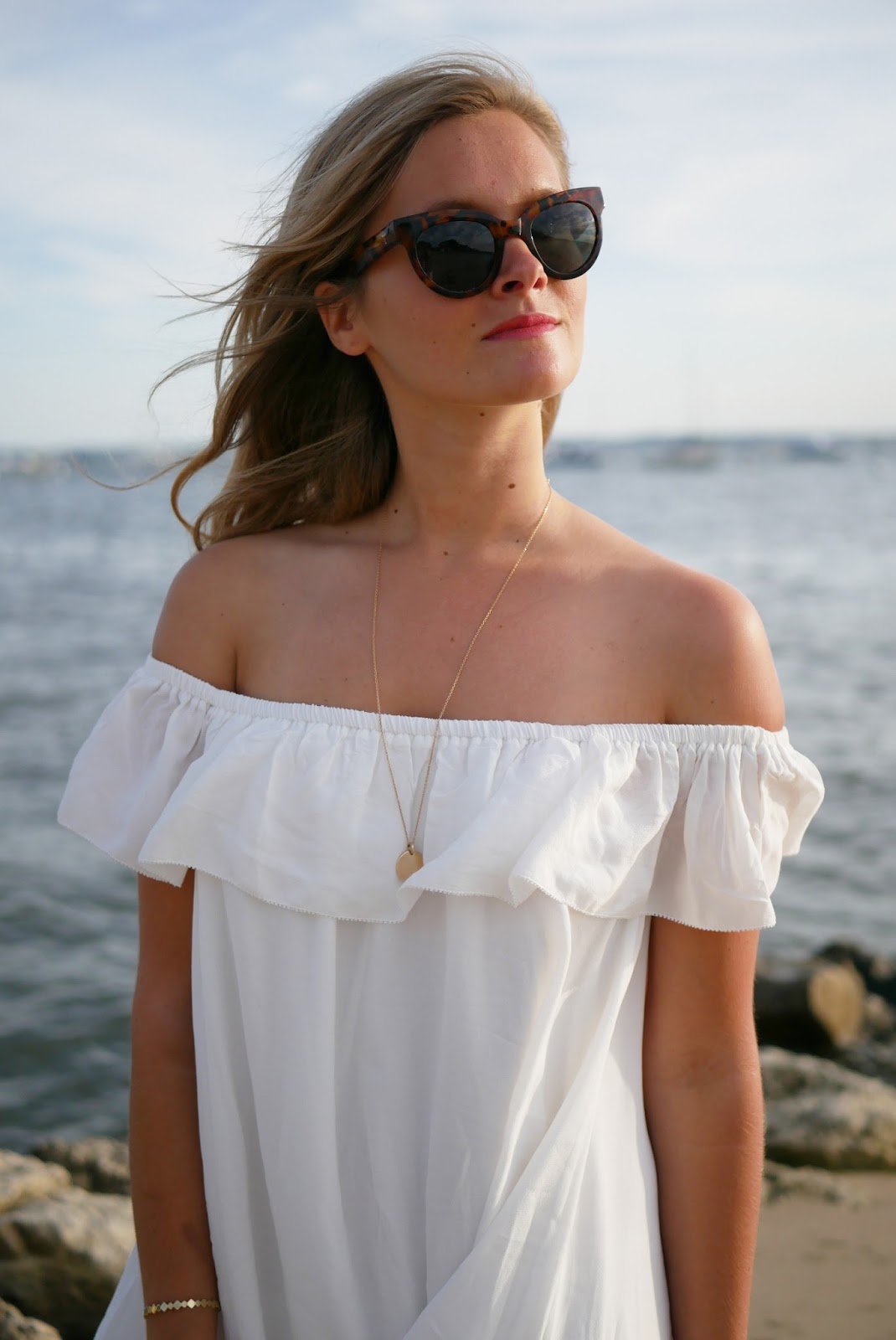 Je trouve que cette tenue est vraiment très simple mais parfaite pour une balade sur la plage le soir. Je trouve que cette robe de part son col bardot et son petit volant en bas se suffit à elle même. C’est, je pense, MA robe préférée de l’été.