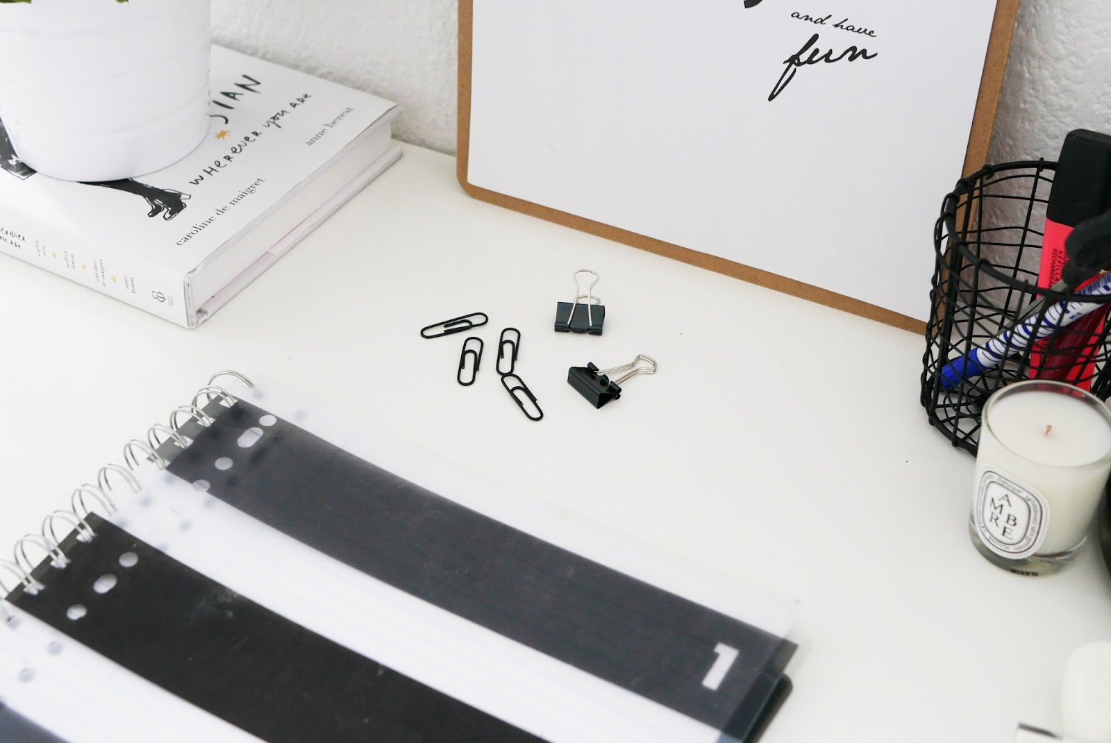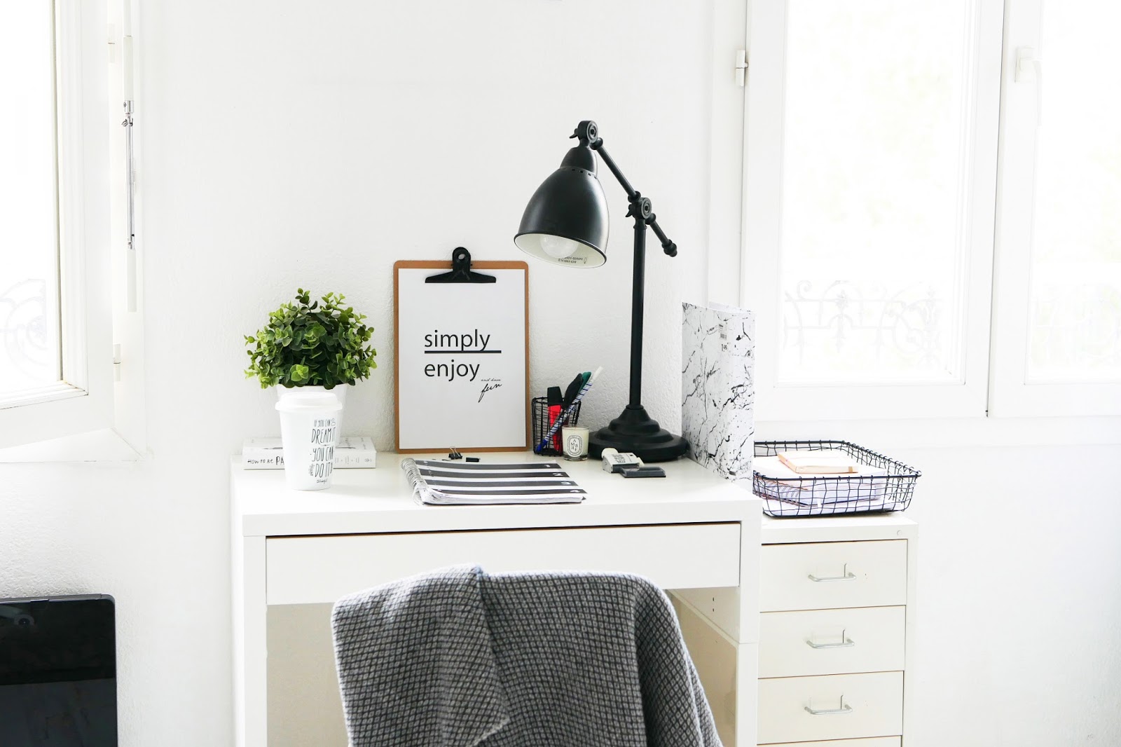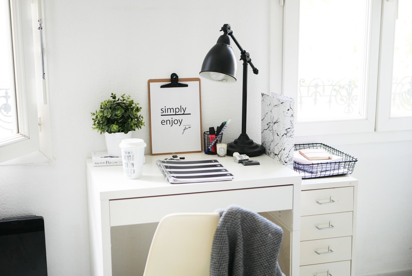 J’y ai donc trouvé le panier que vous pouvez voir en dessous du bureau, la planche avec la pince, le classeur en marbre, le porte documents, le pot à stylos et les petits accessoires de bureau.