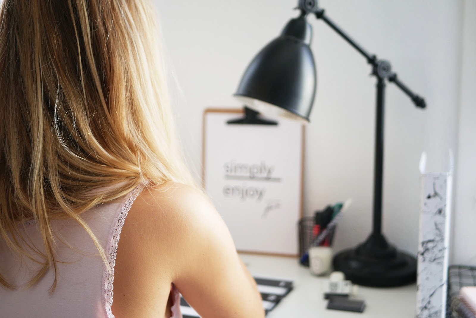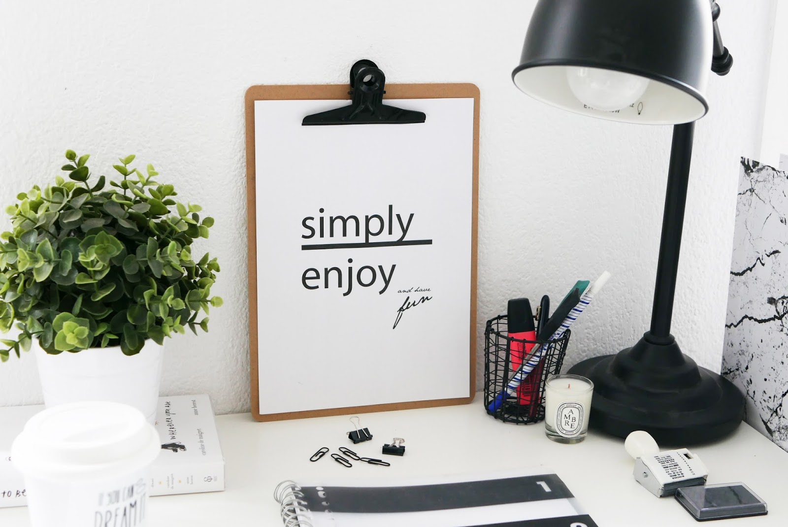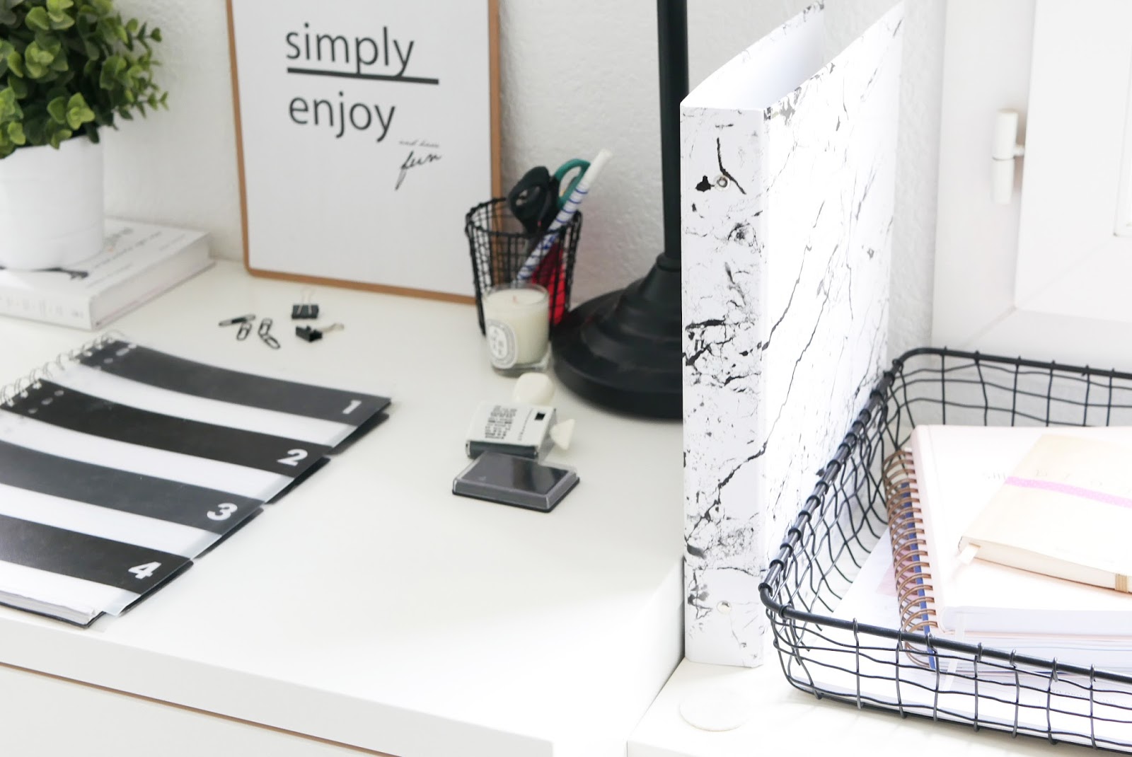 J’y ai donc trouvé le panier que vous pouvez voir en dessous du bureau, la planche avec la pince, le classeur en marbre, le porte documents, le pot à stylos et les petits accessoires de bureau.