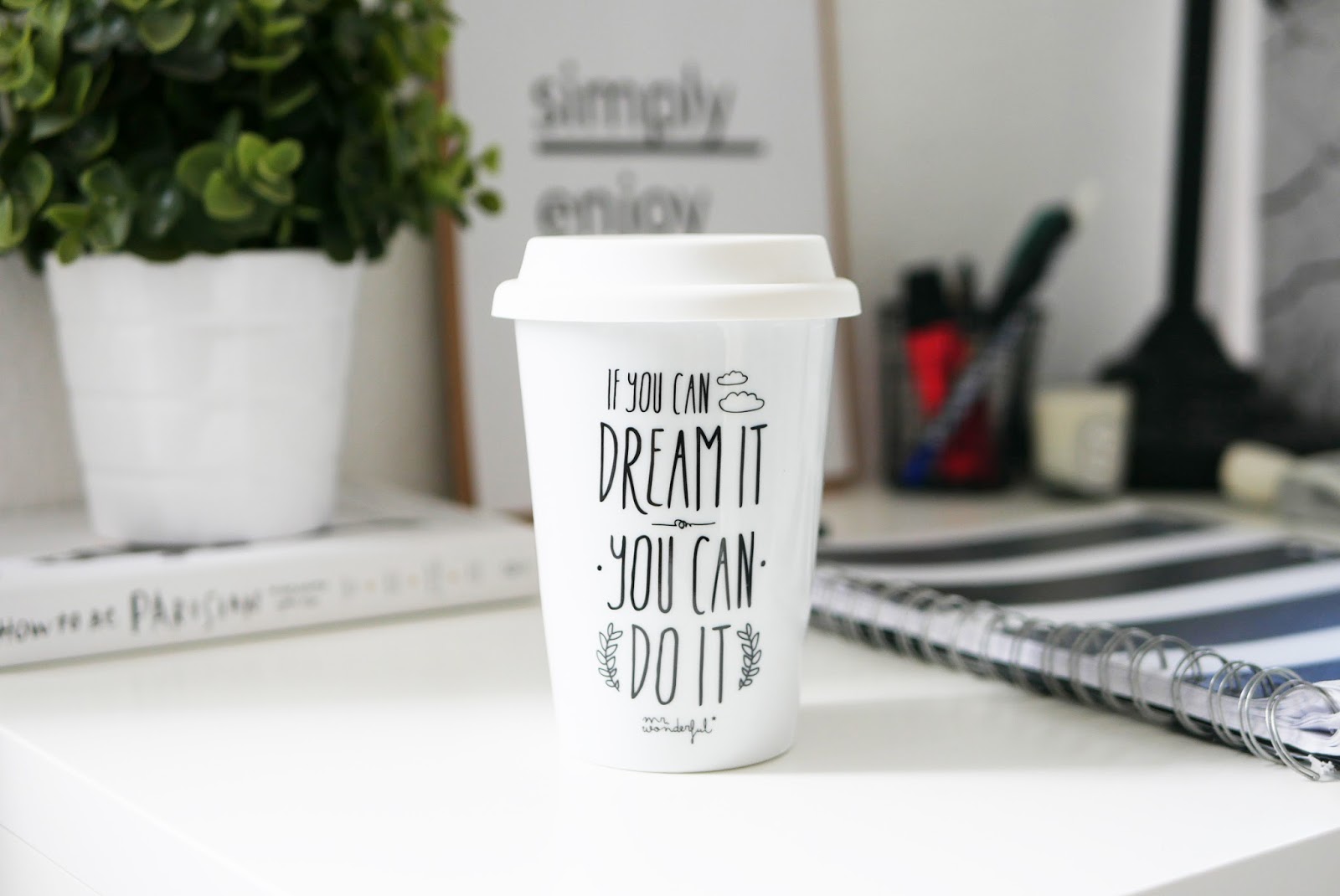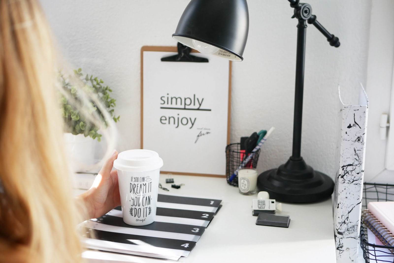 Pour le reste la lampe et la fausse plante ainsi que son pot blanc proviennent de chez Ikea, le cahier et le tampon proviennent de chez Hema, la petite bougie est une Diptyque, le mug vient de chez Mr Wonderful et la chaise a un histoire assez drôle puisque je l’ai trouvé a la déchetterie ahahah !