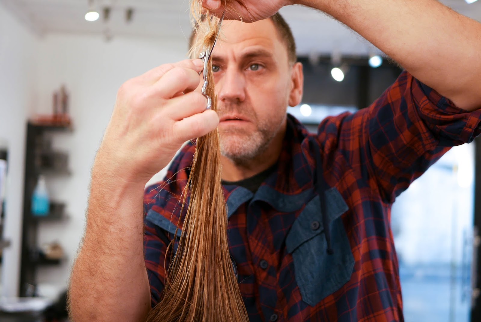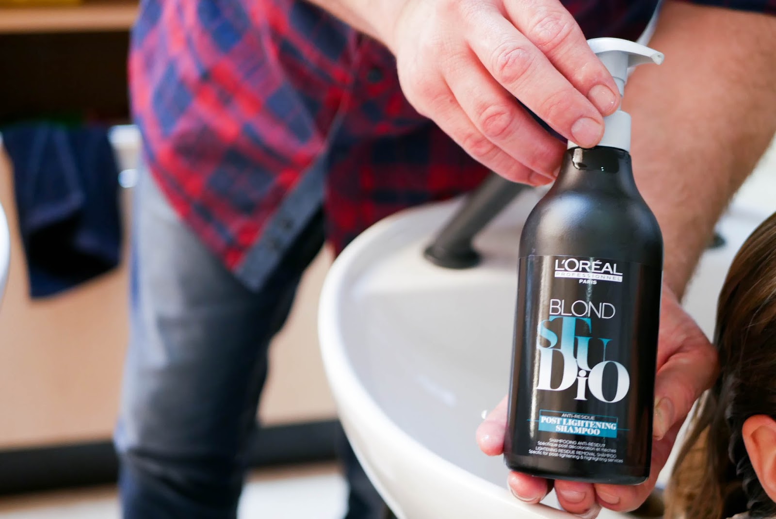 Pour commencer Eric m’a appliqué un shampoing très doux, le Blond Studio de chez l’Oréal Professionnel qui permet de protéger la fibre de la décoloration. Ensuite il a donc commencé par couper mes cheveux afin de pouvoir faire par la suite la décoloration souhaitée. Vous noterez la technique de folie d’Eric pour couper les pointes.