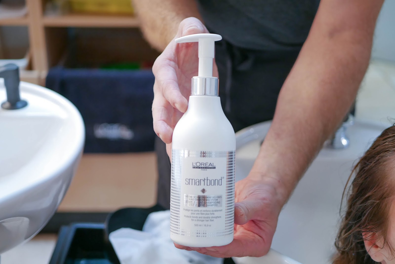Après ce gloss il m’a appliqué un shampoing après couleur puis la fameuse étape 2 du soin Smartbond qui est un après-shampoing. Et enfin par la suite j’ai donc pu tester le nouveau soin Profiber qui est un soin profond qui va venir restaurer en profondeur la fibre des cheveux abimés.