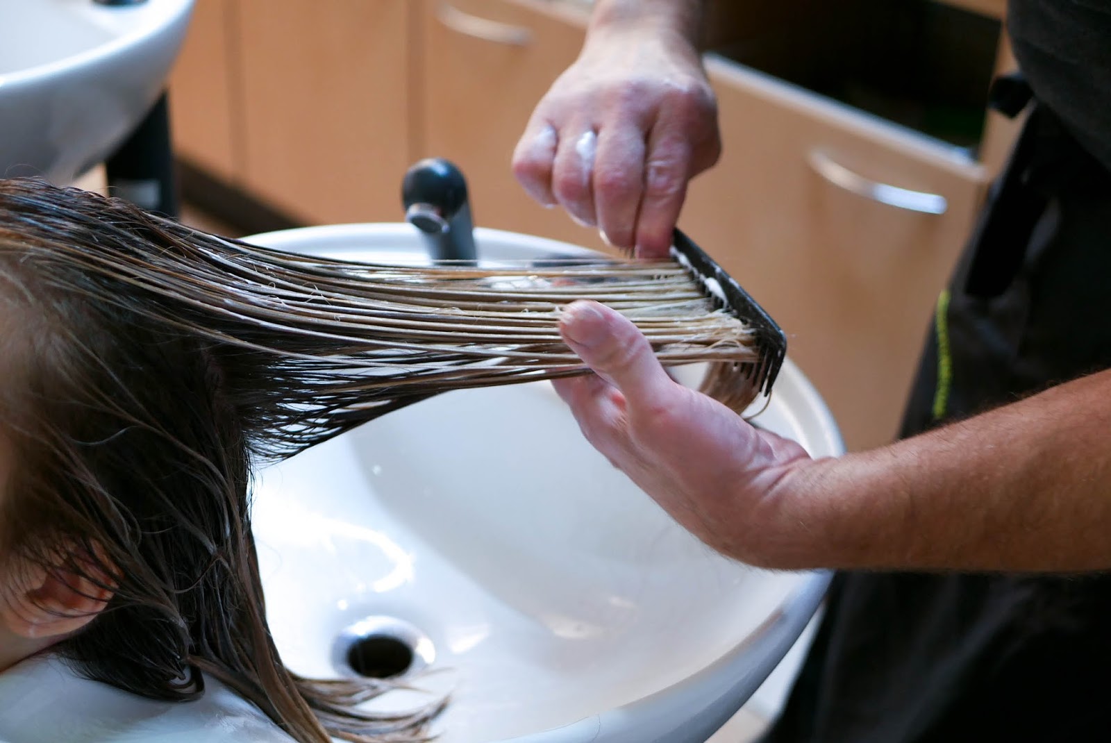 Après le temps de pause, direction le bac ! Eric m’a tout d’abord appliqué un gloss sur toute la chevelure pour unifier et apporter du reflet. En fait, le gloss vient patiner et la patine sert a rétablir la colorimétrie et annuler les mauvais reflets ce qui permet d’obtenir LA teinte souhaitée et une certaine harmonie dans la lumière car il contient des capteurs de lumières.
