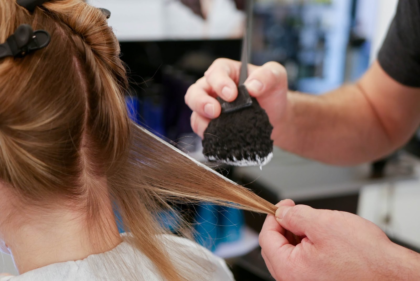 Pour créer des fondus de lumières sur les cheveux, Eric a utilisé un gant sur un pinceau pour appliquer ce mélange. Cela permet de travailler beaucoup plus en douceur que n’importe quels outils pour la lumière.