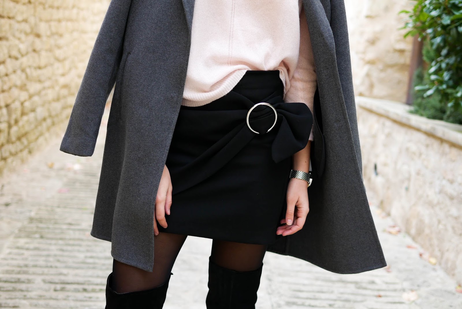 Concernant la tenue je porte un nouveau manteau gris que j’ai acheté chez Zara durant mon séjour en Andorre, à 28 euros je ne pouvais que craquer ! Il est assez fin mais est vraiment tout doux. Le petit pull rose provient de chez Onestep, il est en cachemire et est évidemment tout doux ! J’avais à la base choisi celui en gris mais ayant déjà des tonnes de pulls gris j’ai craqué pour celui-ci et je ne regrette absolument pas ! La jupe quant à elle provient aussi de chez Zara et je l’ai aussi prise quand j’étais en Andorre.