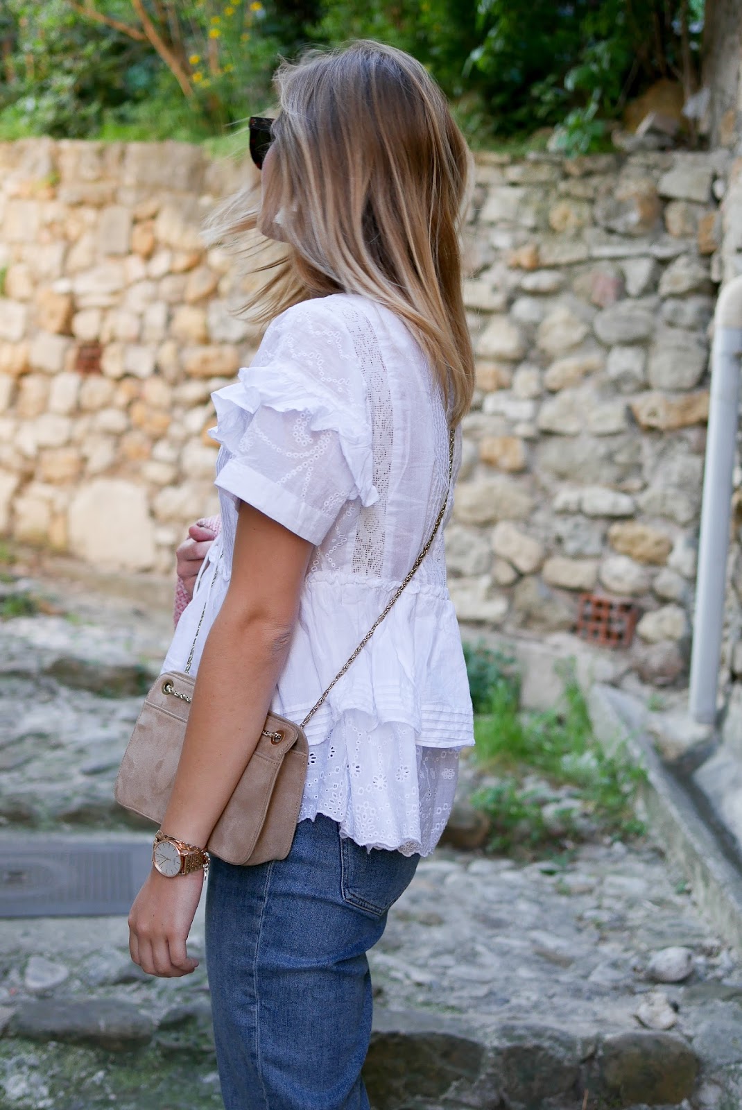 Associé à ça une petite blouse blanche à broderies de chez The Kooples et mon sac sézane shoppé lors des archives. Je ne regrette d’ailleurs pas du tout mon achat car sa couleur beige va vraiment avec tout !