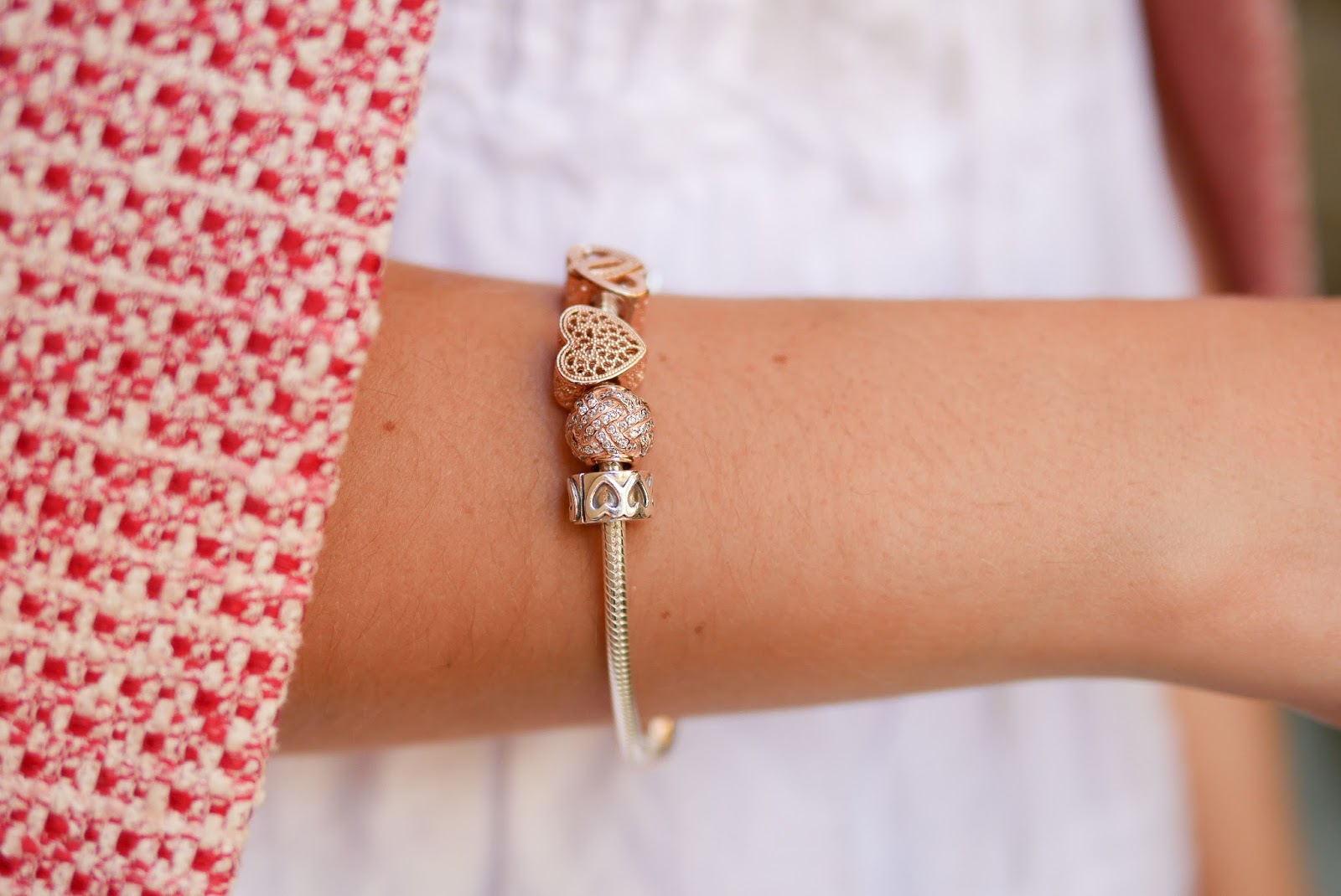 A mon poignet mon premier bracelet Pandora en argent et rose gold. Moi qui ai du mal avec l’argent le fait qu’il y a du rose gold me permet de le porter et de beaucoup l’aimer ! Je le porte notamment avec ma montre rose gold de chez Tissot. Bref je l’adore !!