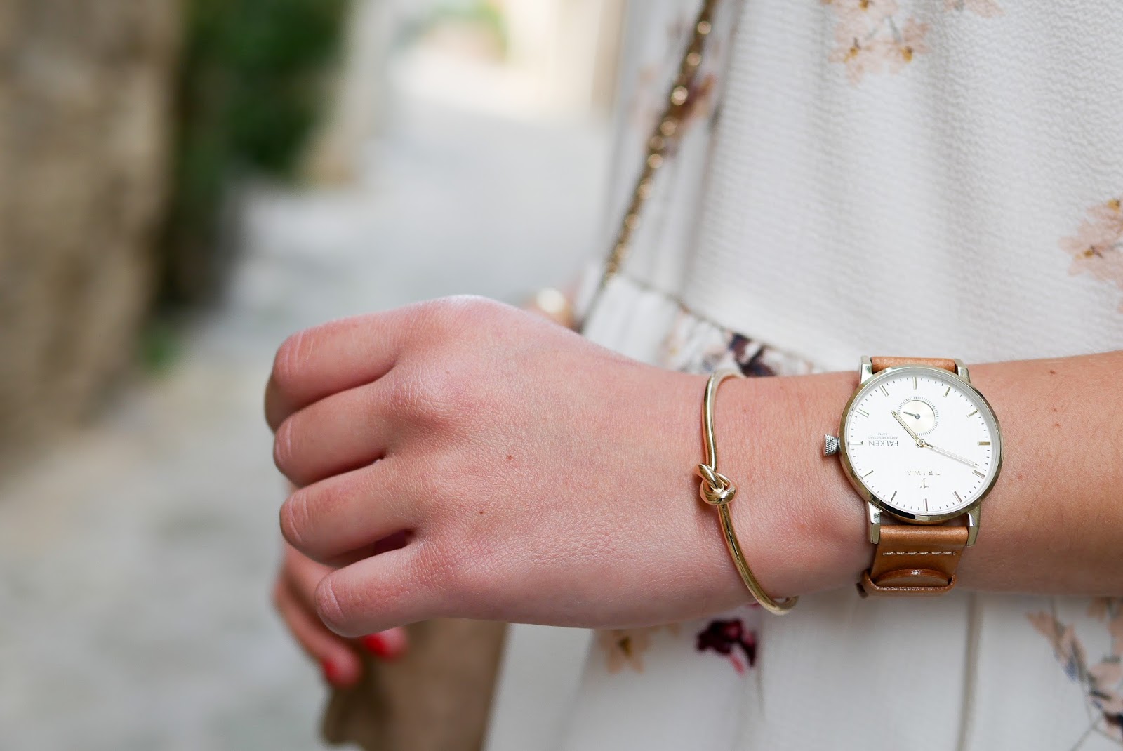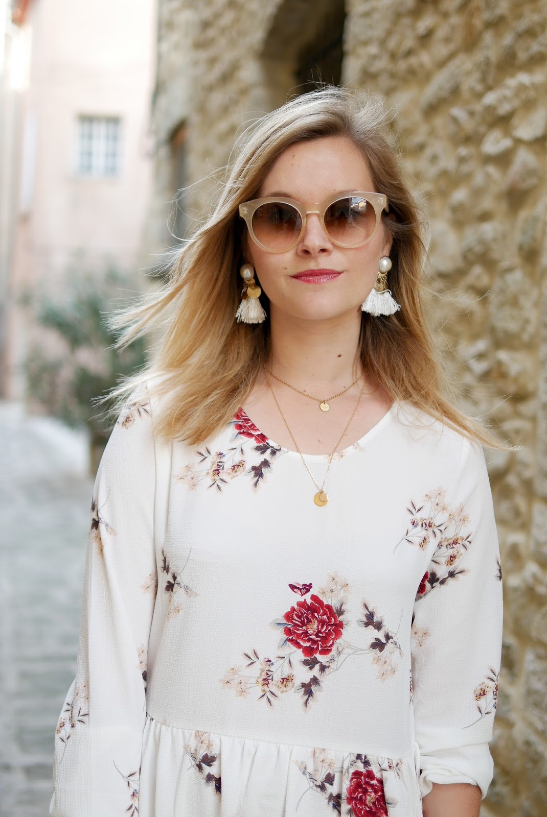 Pour accessoiriser cette robe fleurie j’ai choisi de porter du beige avec ce petit sac de chez Sezane, des sandales à talons de chez Bobbies que vous pouvez trouver ici et mes nouvelles lunettes de soleil de chez Jimmy Fairly ! Coté bijoux je porte  une manchette Bangle up, un bracelet nœud inspi Céline de chez la boutique du bracelet, des BO H&M et une montre Triwa. Je sais qu’il ne faut normalement pas assortir ses chaussures avec son sac mais personnellement c’est quelque chose que j’adore faire surtout quand il y a déjà pas mal de couleurs sur la tenue en elle même ! 🙂